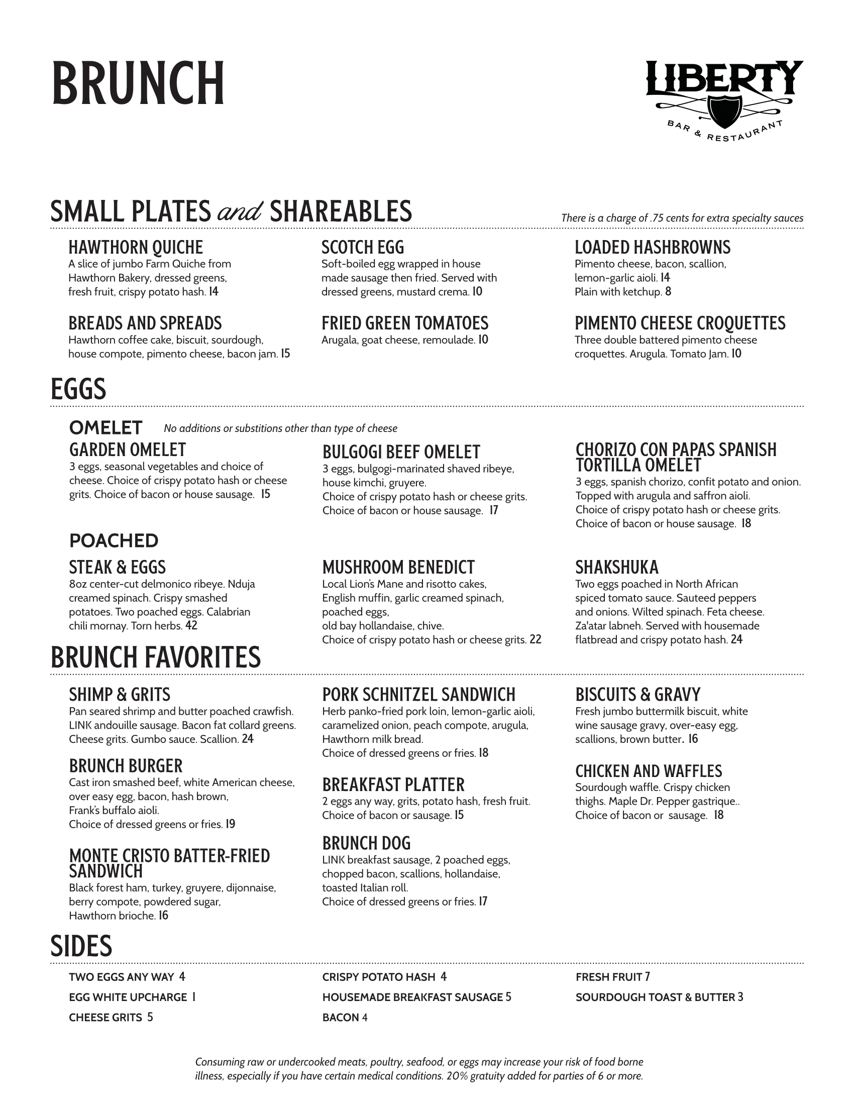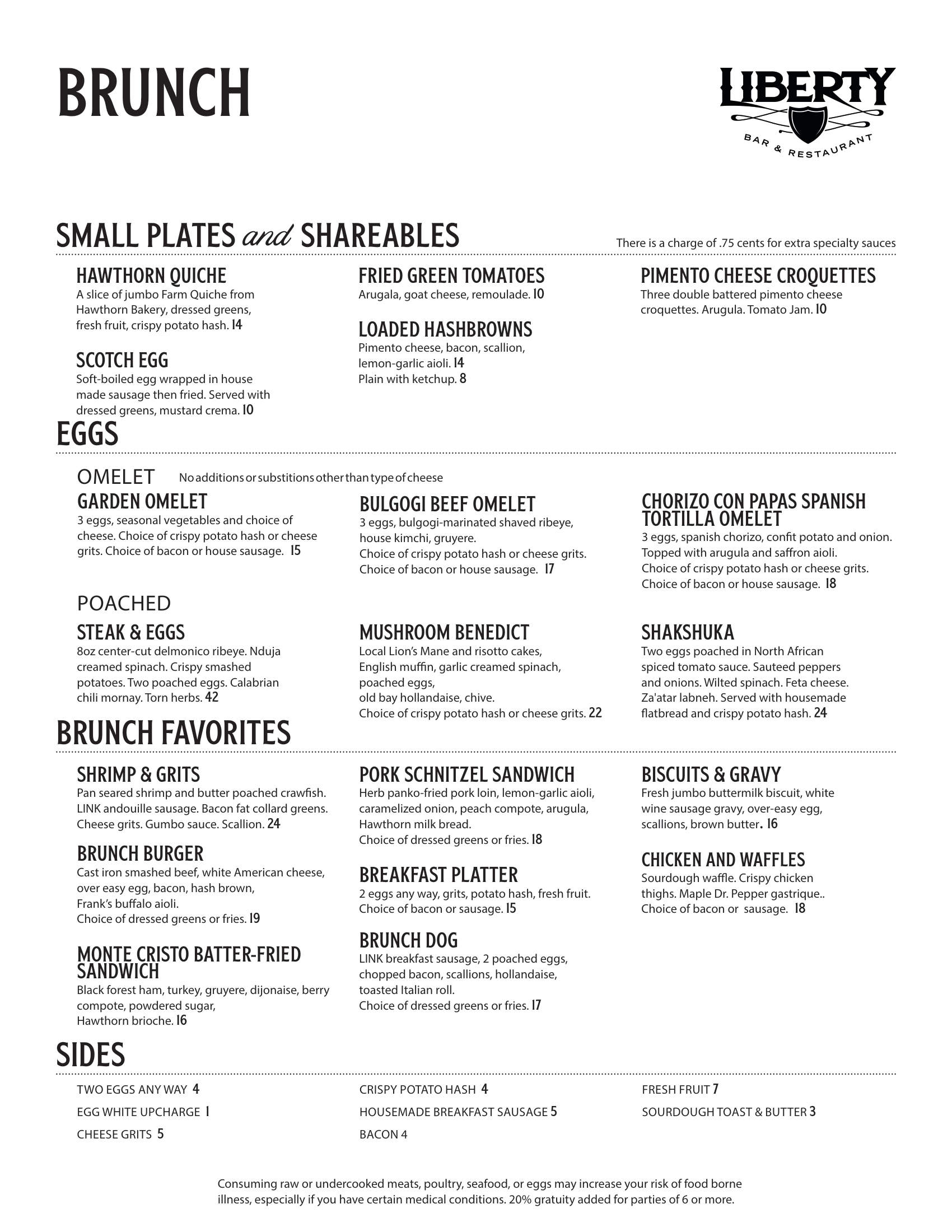 BRUNCH Saturdays & Sundays10:30am - 3:00pm Our menus are seasonal and subject to changePlease note that Liberty cannot accept reservations